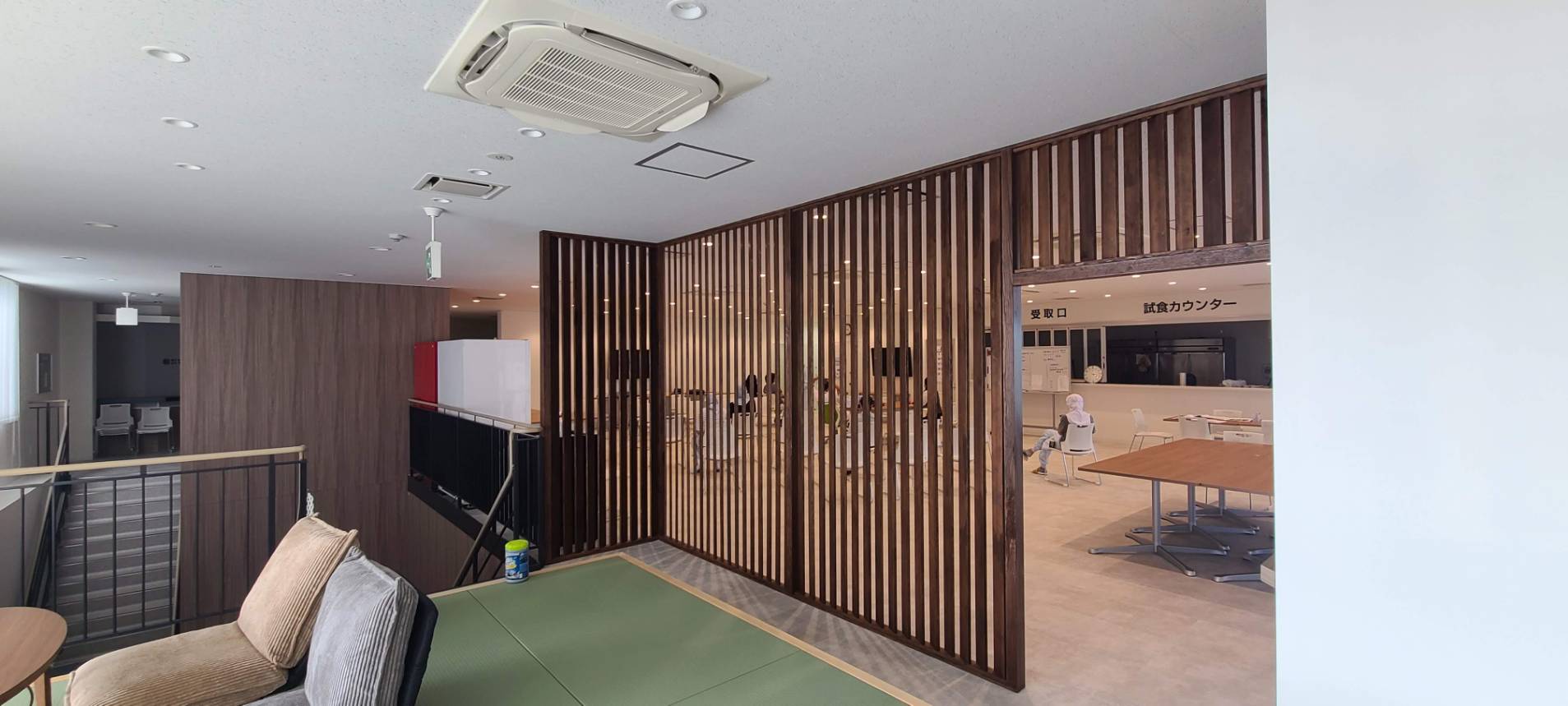 木の質感を生かしたルーバー間仕切りで、空間に落ち着きと統一感を演出。